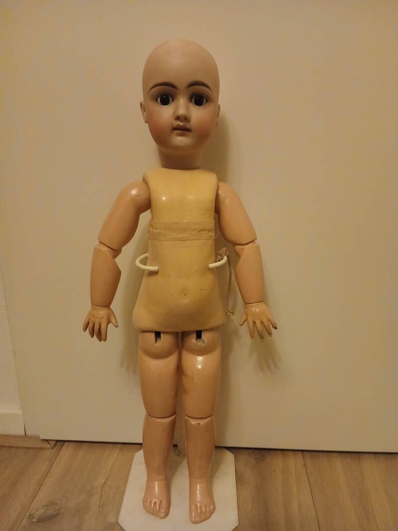 Antique Jullien doll. She stands 58 cm or 22.8 inches tall. There are no hairlines, cracks or chips. Her body is in a good condition. Her torso shows some color difference to the rest of her body, it was most likely repainted. She has a working mama voice when pulling the cord coming from her belly. Her eyes are sleepeyes. She is most likely all original. Her shoes are marked J.Jne, but they are not in the best condition anymore. Her dress appears to be original and her wig, quite worn, it original as well. Only her earrings and a brown underskirt were added.