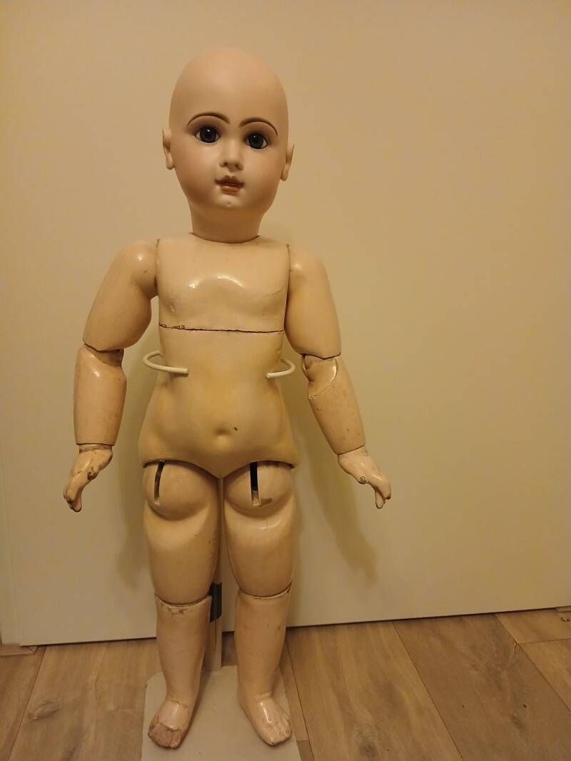 How amazing is this Jumeau doll? She has a closed mouth and is a rarely seen large size, standing at 31.5 inches or 80 cm tall. She has no hairlines or cracks. There is a small chip to one of her earringholes to note. Her original body shows some wear, as visible in the pictures. She comes dressed as shown. Her wig and cork pate are original.