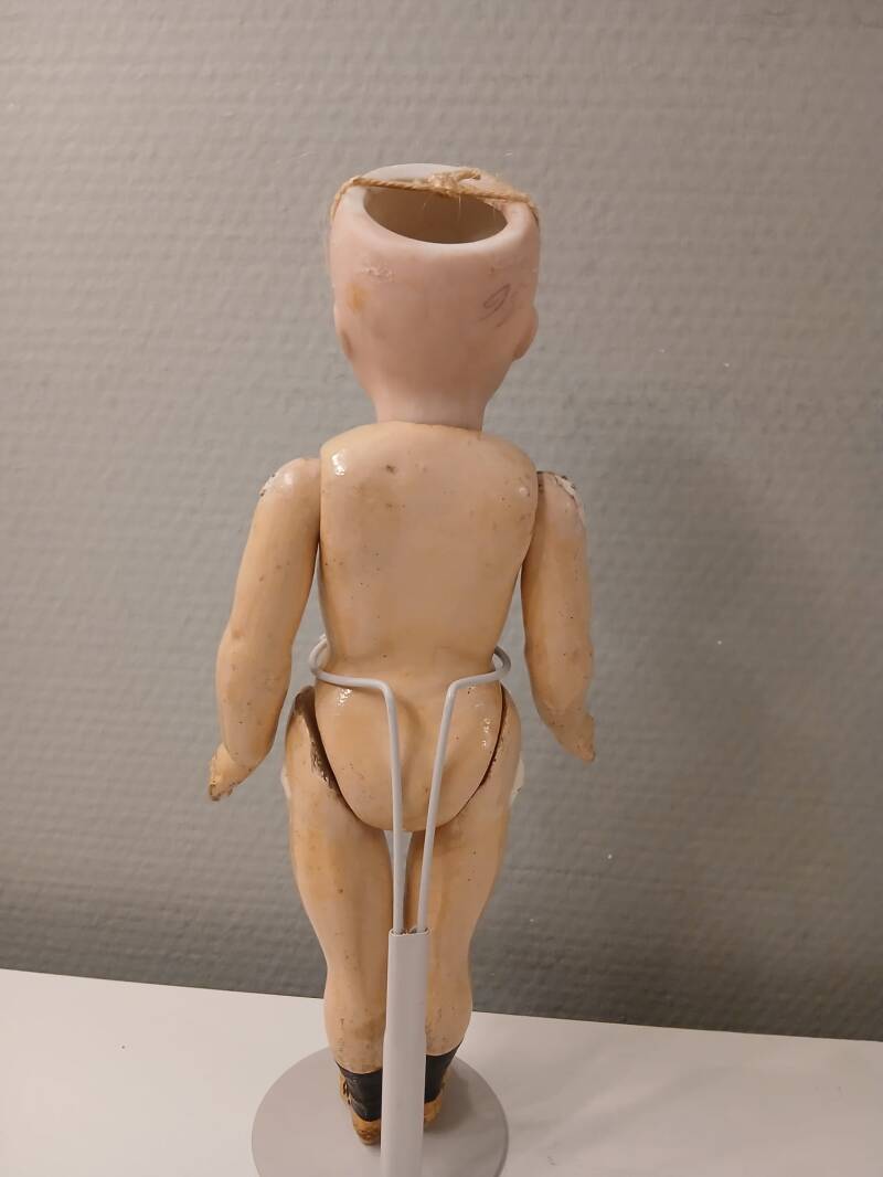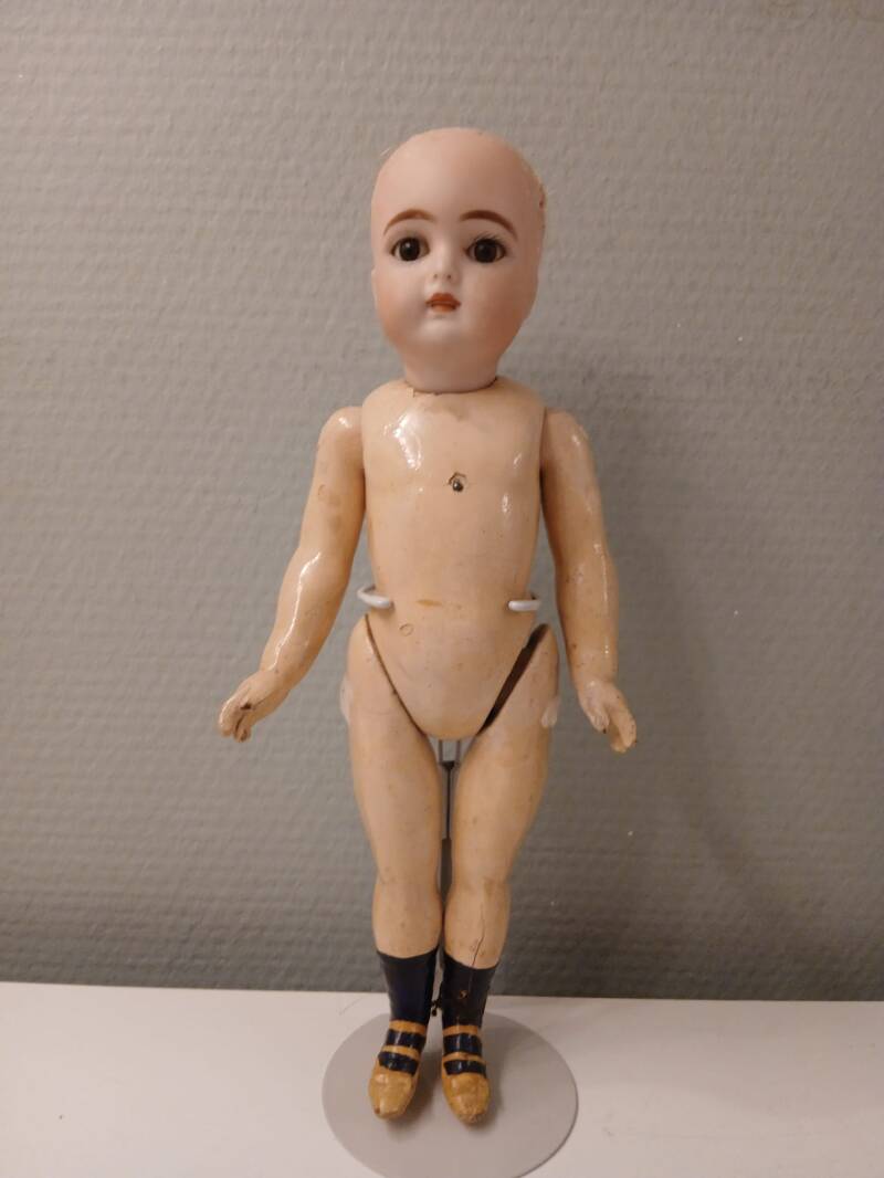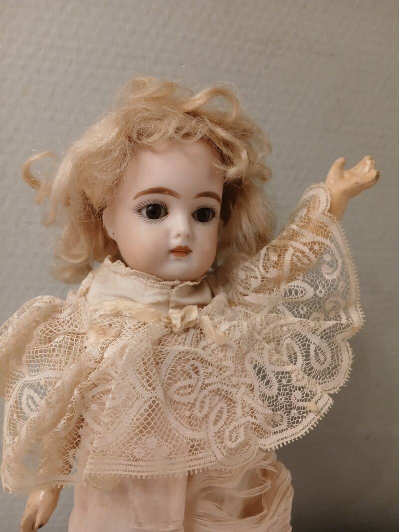 Her head is in a perfect condition, without hairlines. There are some glue rests at the top of her head to note from her original wig. She stands on a 5 piece composition body with painted two-strap shoes. The body is in a good condition, except for the right lower leg, which has been repaired. It is stable, but has been broken once.