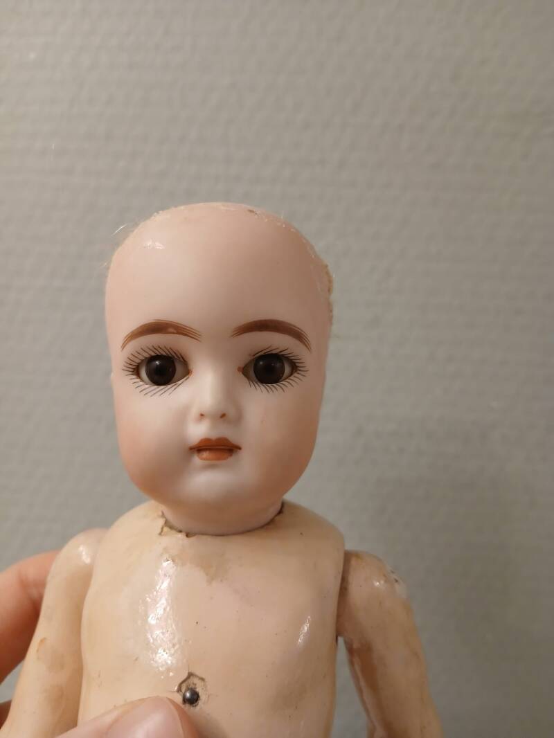 Little Kämmer & Reinhardt 192 doll. She is 10.5 inch or 27 cm tall. She has a closed mouth and pierced ears. She is marked very faintly, but it says ''192''. This mold comes both with open and closed mouth, but the closed mouth one is not seen often. Her eyes are sleepeyes.