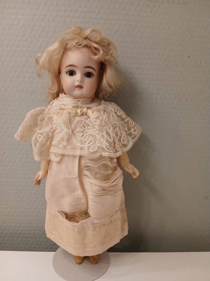 She wears her most likely original outfit and wig. Her dress is fragile and unfortunately fading away (see pictures). Her underwear and wig are in a good condition.